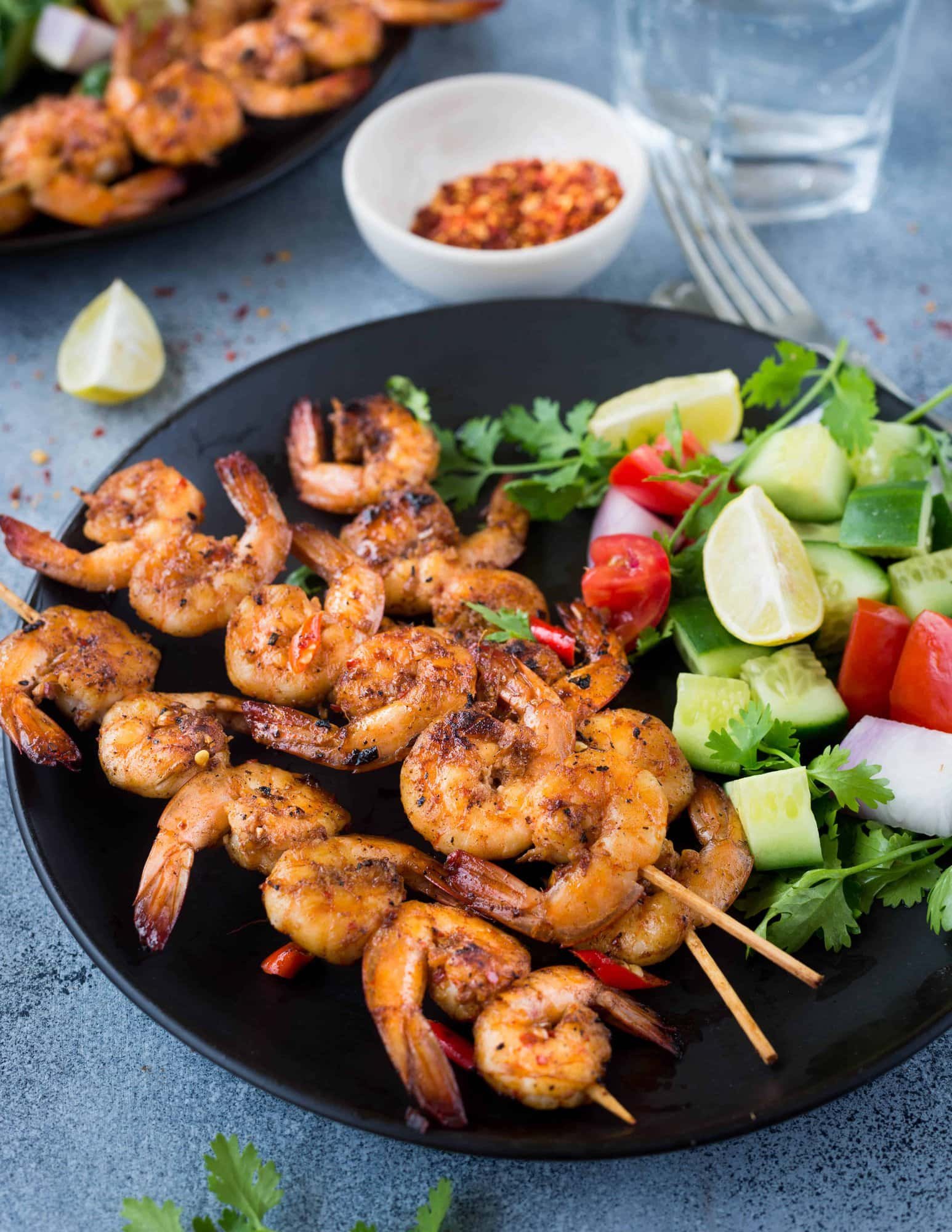Grilled shrimp marinated in garlic, lemon, and spices. Smoky, juicy, and served hot with parsley garnish.