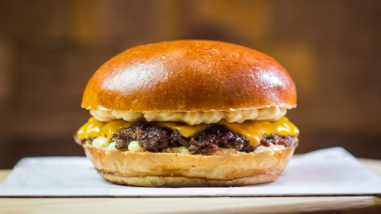 Juicy smashed beef patty with melted cheese, caramelized onions, and fresh toppings on a soft bun.